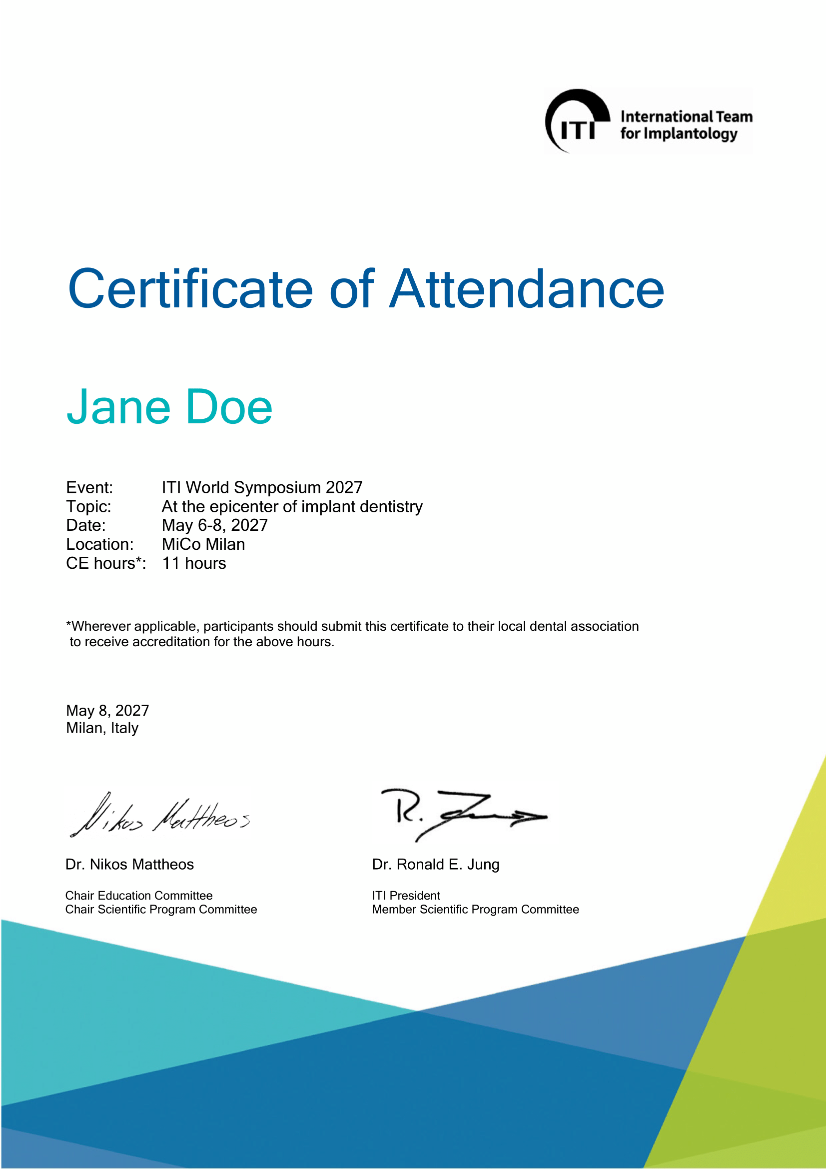 Each participant of the ITI World Symposium will receive an electronic ITI Certificate of Participation.